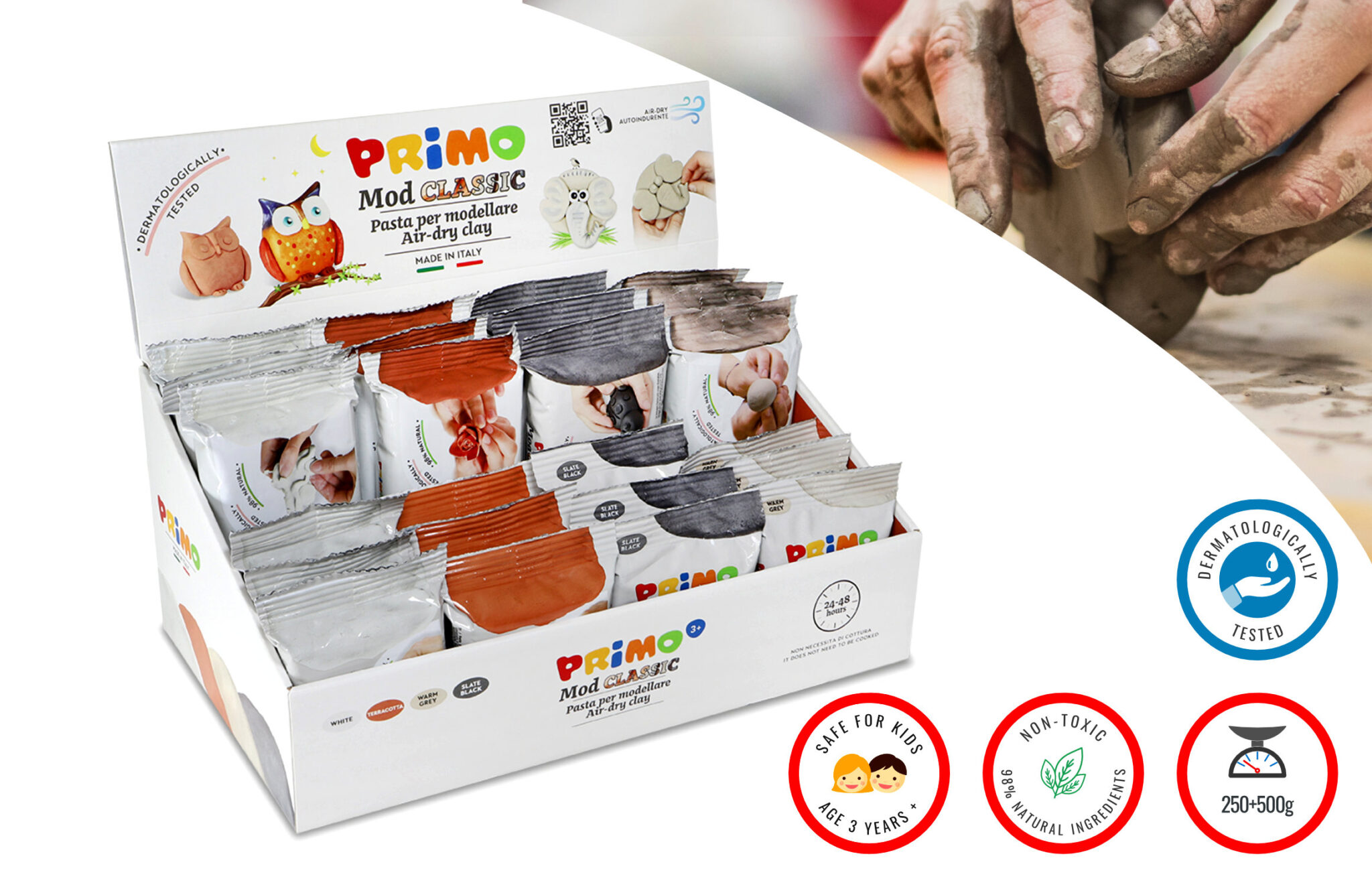 CMP Primo Modelling Clay Air Drying Display Classic x24, Ass col 3 of each 250g, White, Terracotta, Black Slate and Grey, and 3 of each 500g, White, Terracotta, Black Slate and Grey, ready to use, no need for baking, after air drying it can be it can be drilled, sanded, painted and varnished, ideal for art room group activities, Made in Italy, code 28513MODASSMM