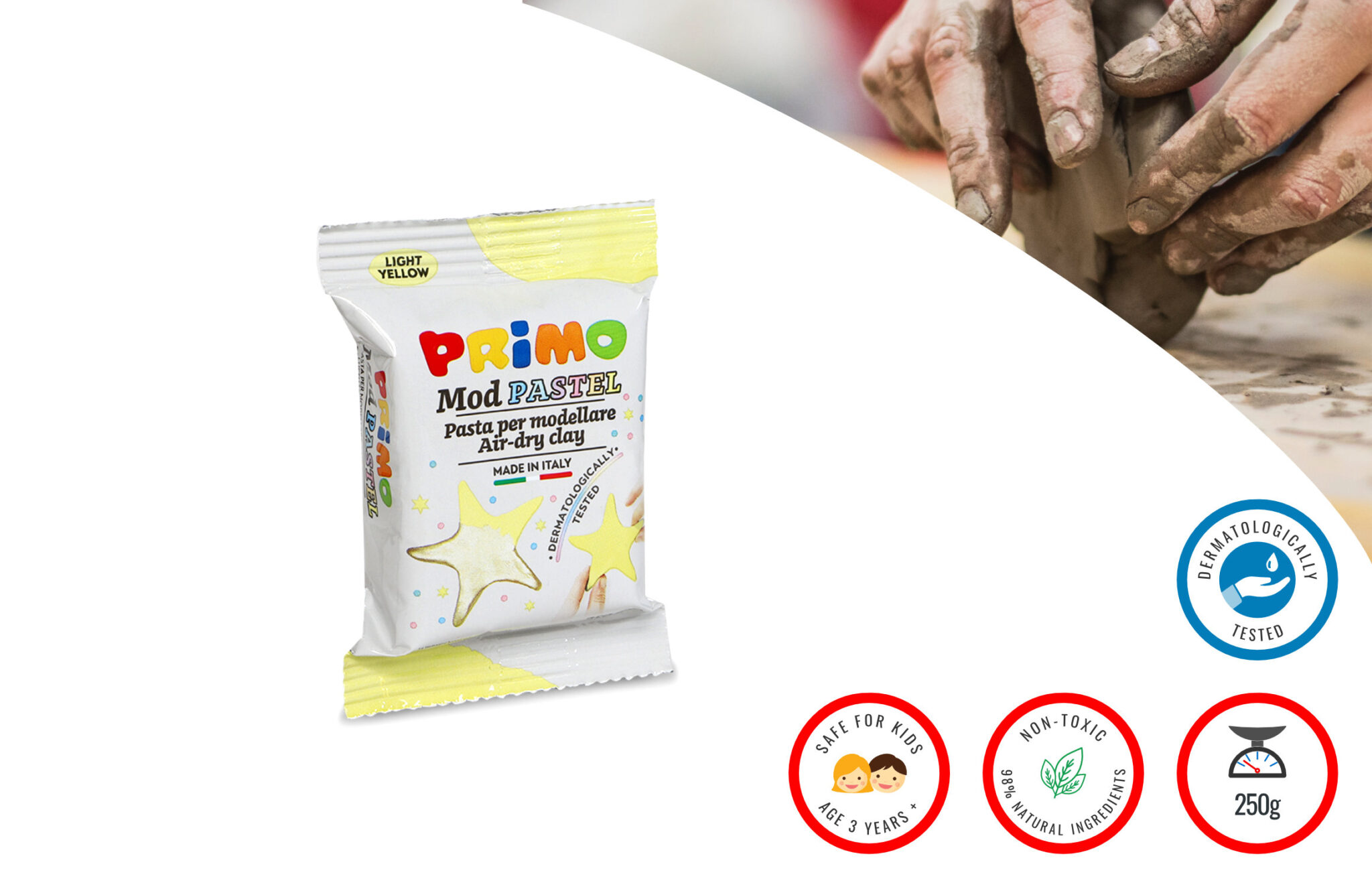 CMP Primo Modelling Clay Air Drying, Yellow 250g, ready to use, no need for baking, after air drying it can be it can be drilled, sanded, painted and varnished, ideal for art room group activities, Made in Italy, code 2855MOD250212