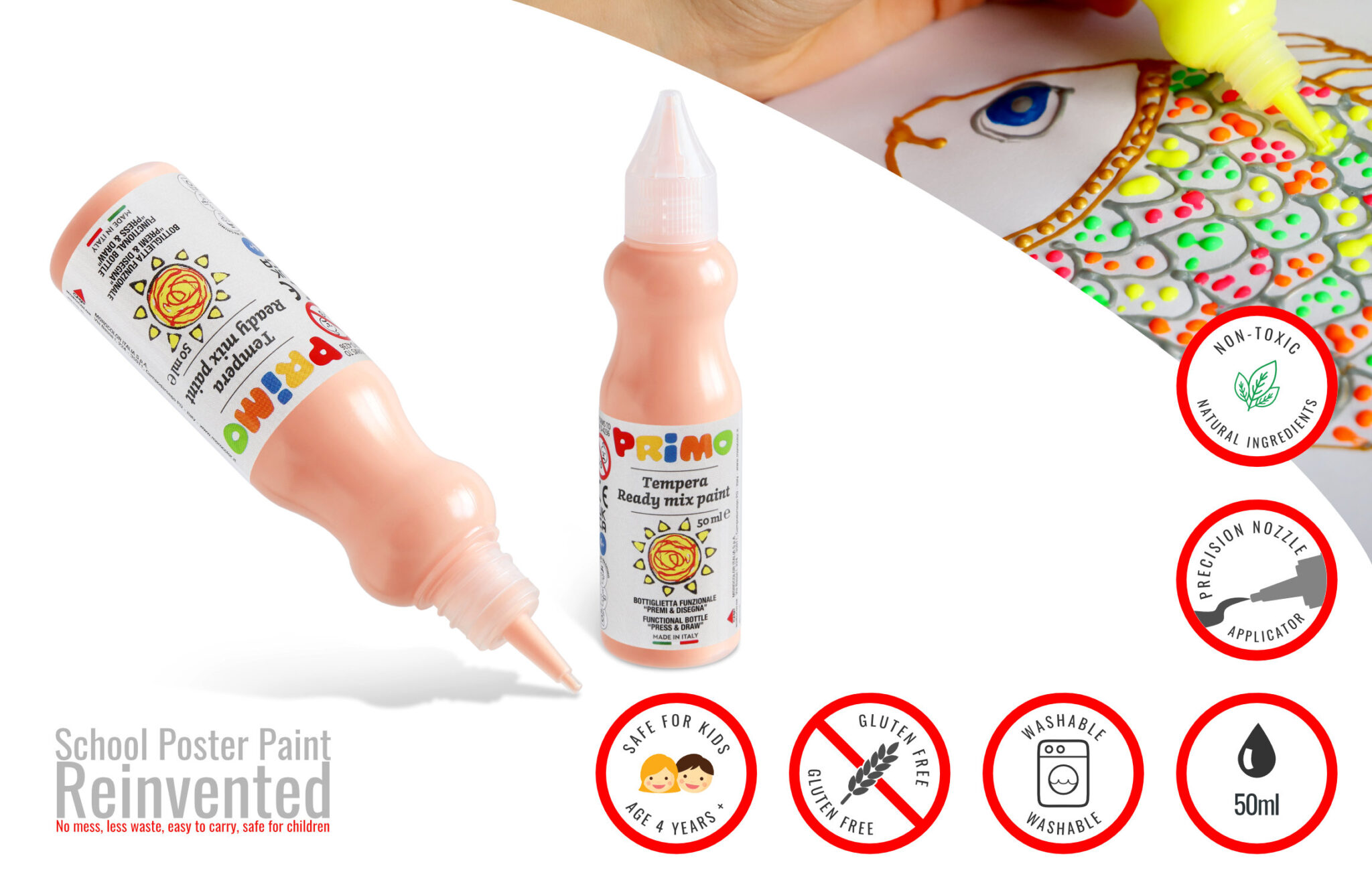 CMP Primo Poster Paint School 50ml bottle col 331 pink flesh, ready mix paint in ergonomic bottle with flow-control nozzle that allows to be used as a graphic tool or to dose the paint with high precision before using a brush to apply it, allows for opaque and overlapping layering, brushstroke is uniform, with excellent results of brilliance and vivacity of tones, an be used on different surfaces such as paper, cardboard, wood, fabric, glass, terracotta, metal and plastic, paint is not permanent but it can be fixed with a suitable fixative, washable, Made in Italy, code 2001BR50331