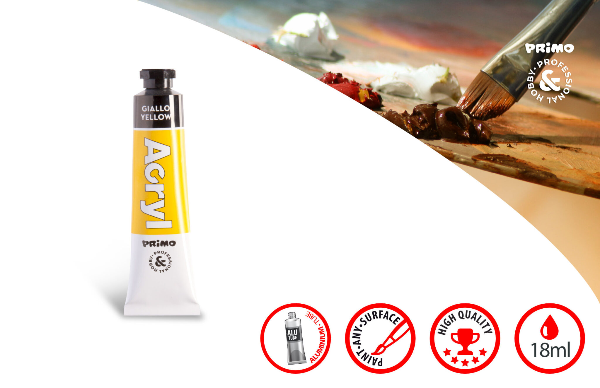 CMP Primo Acrylic Paint 18ml tube in aluminium colour 201 Yellow Primary, water-based paint, high concentration of pigmented acrylic suspension, offering high opacity, is completely permanent once dry (at least 24 hours), can be used on any type of surface, perfectly suitable for various professional painting techniques, as well as decoration and hobby activities such as decoupage, Made in Italy, code 405R201