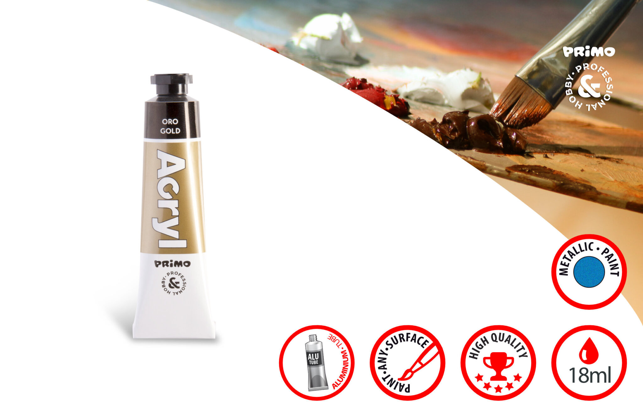 CMP Primo Acrylic Paint 18ml tube in aluminium colour 920 Gold, water-based paint, high concentration of pigmented acrylic suspension, offering high opacity, is completely permanent once dry (at least 24 hours), can be used on any type of surface, perfectly suitable for various professional painting techniques, as well as decoration and hobby activities such as decoupage, Made in Italy, code 405R920