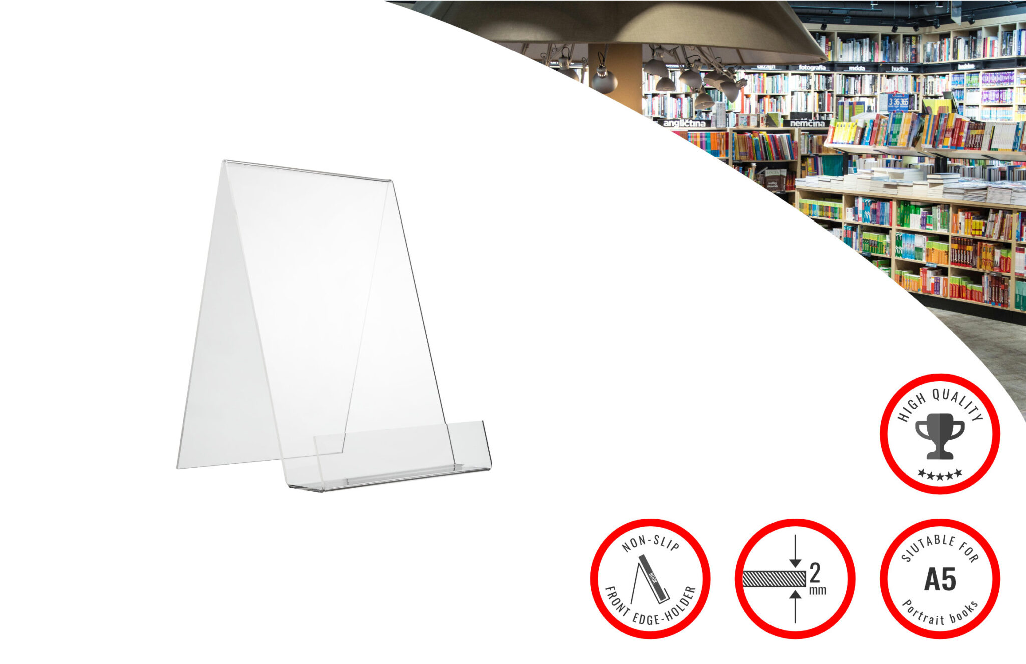 MOLE Display Stand, for Book +Holder, Acrylic Clear, Vert A5 Portrait, stand, for book with holder, made of acrylic 2mm, perfect for displaying products or as a product holder at the point of sale, as well as in private use as a bookstand or cookery book holder, made of high-quality finish crystal clear acrylic, UV-resistant, the front stand prevents the product to be displayed from slipping, the support surface is open to the left and right and can therefore also be used for wider products than the specified format, filling height / filling depth 28mm