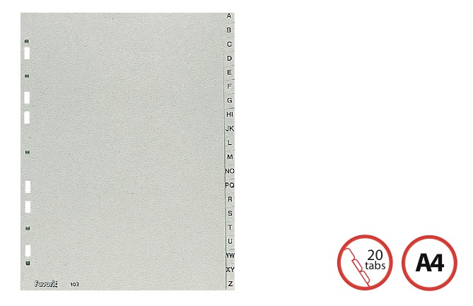 Elba A4 Tabbed Dividers made in opaque Polypropylene. Pack of 20 A-Z grey dividers. Multi-punched spine, designed to fit most types of binders. Easy to wipe clean so they can be reused multiple times. Cod.400006681. Made in Italy.