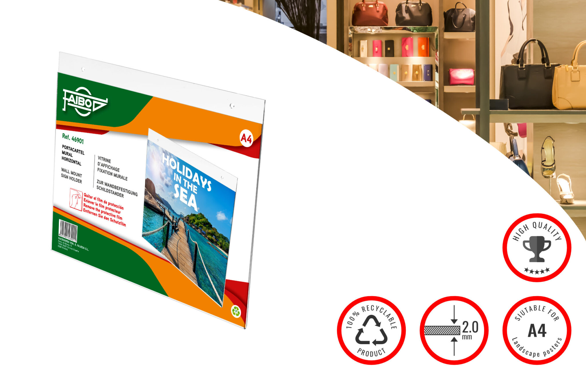Faibo Sign Holder Wall Hanging A4 Landscape inserts, made from transparent polystyrene, material thickness 2mm, top-loading, quick content changes, ideal for offices, retail spaces, schools, public buildings, perfectly suitable for promotions, product information, menus, price lists, notices and signs in general, protective film for extra protection during transport, external format LxW, 29.7×23.4cm, including back protrusion approx 21mm on long side with hanging holes 4mm diameter, made from 100% recyclable materials, ref. 46901