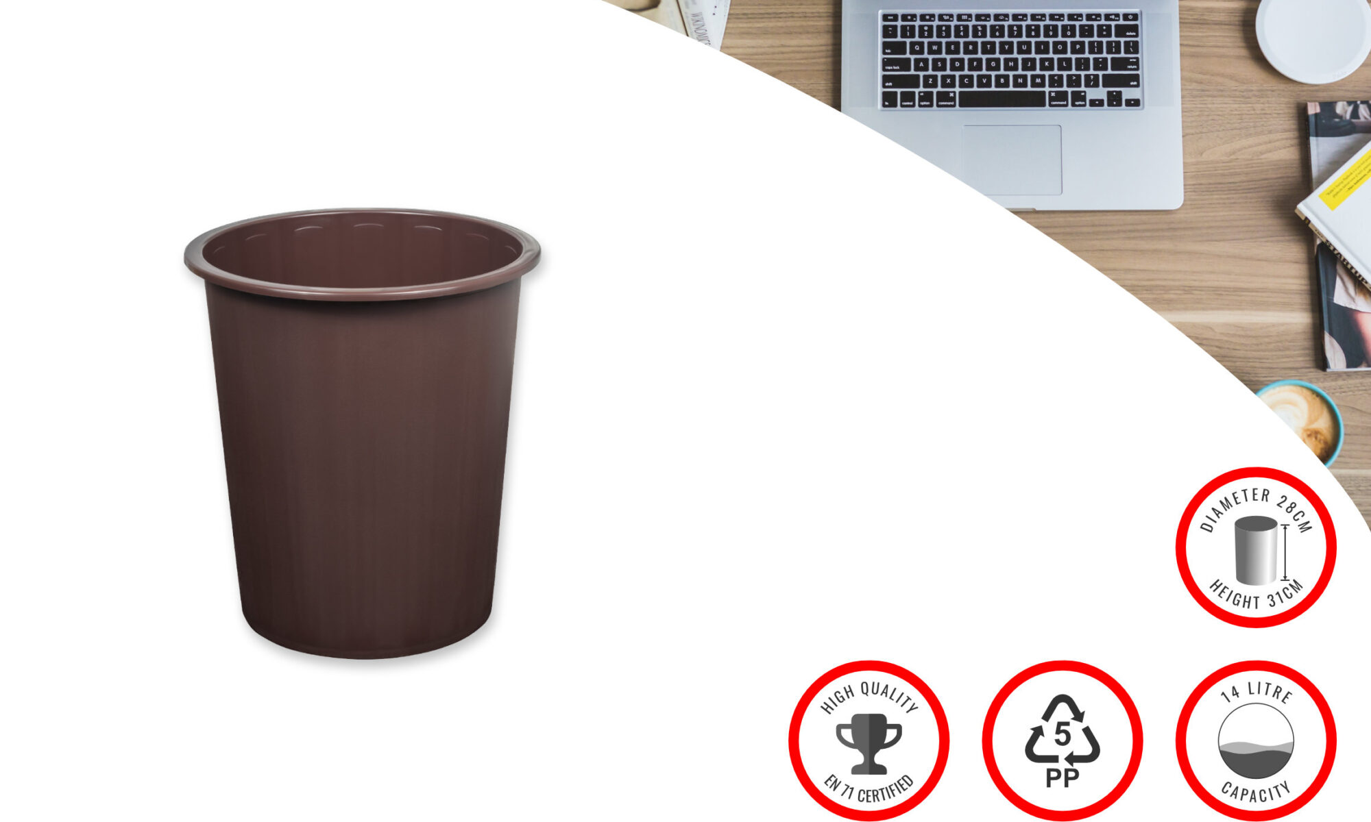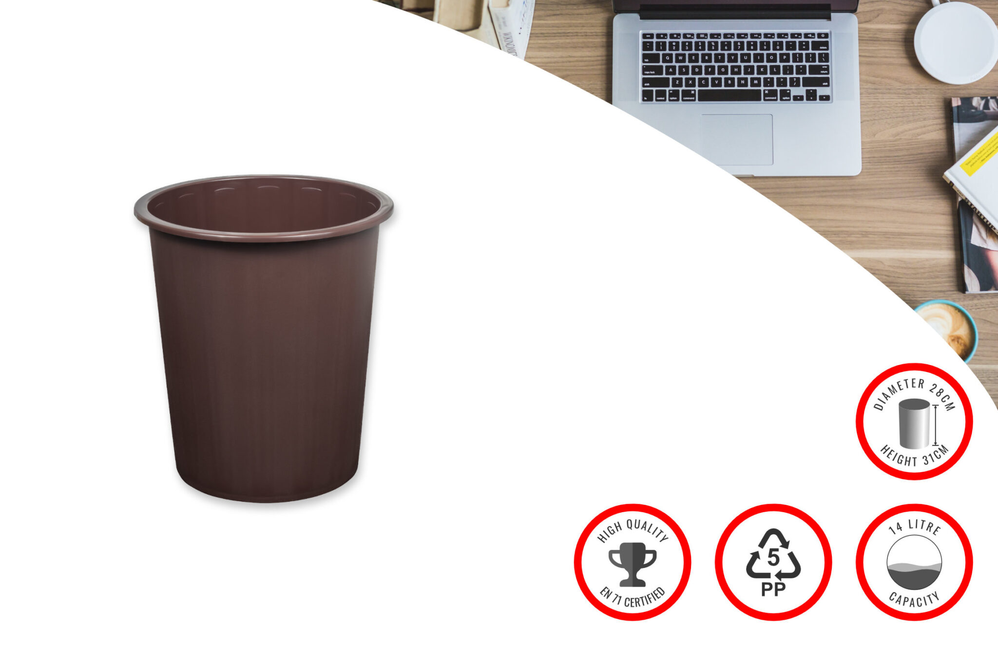 Faibo Waste Paper Bin 14Ltr Brown, made of polypropylene plastic, measuring : 310×280 mm, capacity:14 l, 100% recyclable, made in Spain, ref 305 09