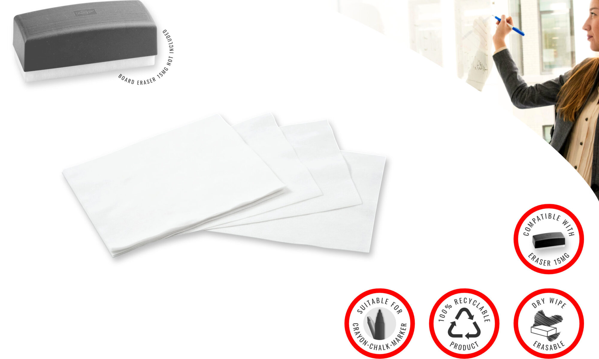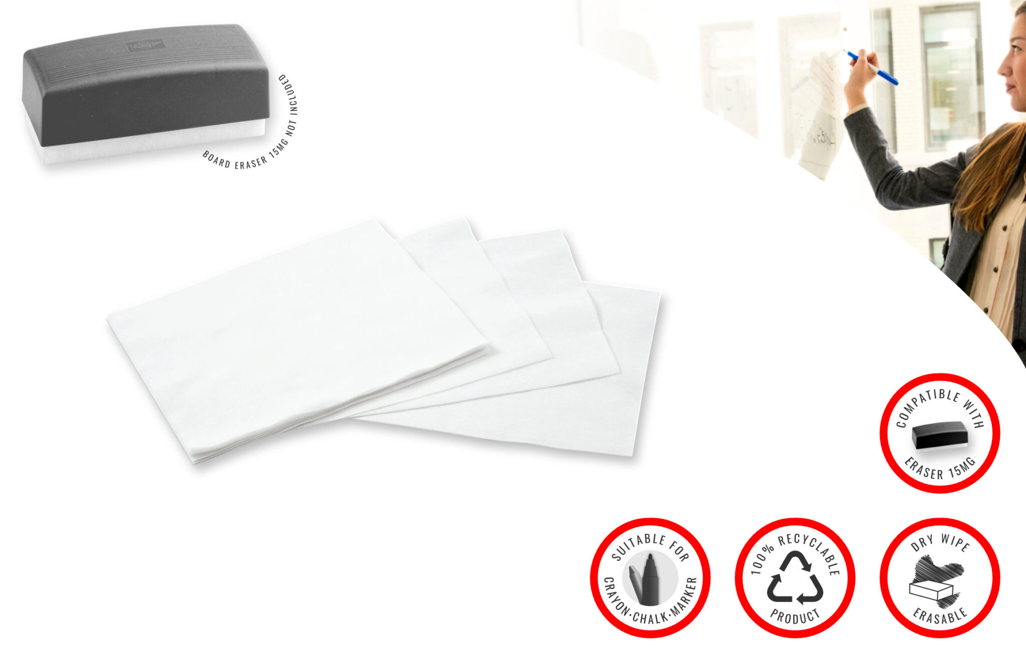 Faibo Whiteboard Eraser Drywipe Tissues (5pc x bag), 100% recyclable, made in Spain, ref 15RC