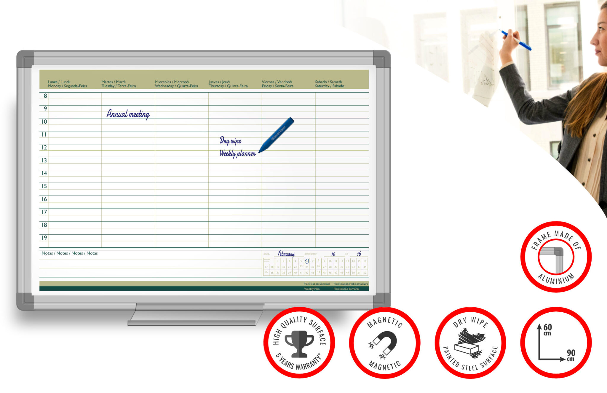 Faibo Whiteboard Planner WEEK Magnetic 60x90cm Alu trim+tray, surface printed in two colours, to be used with magnets as well as with dry board markers, aluminium frame and decorative corners, supplied with 40 cm aluminium tray and wall holders, made in Spain, ref PLS