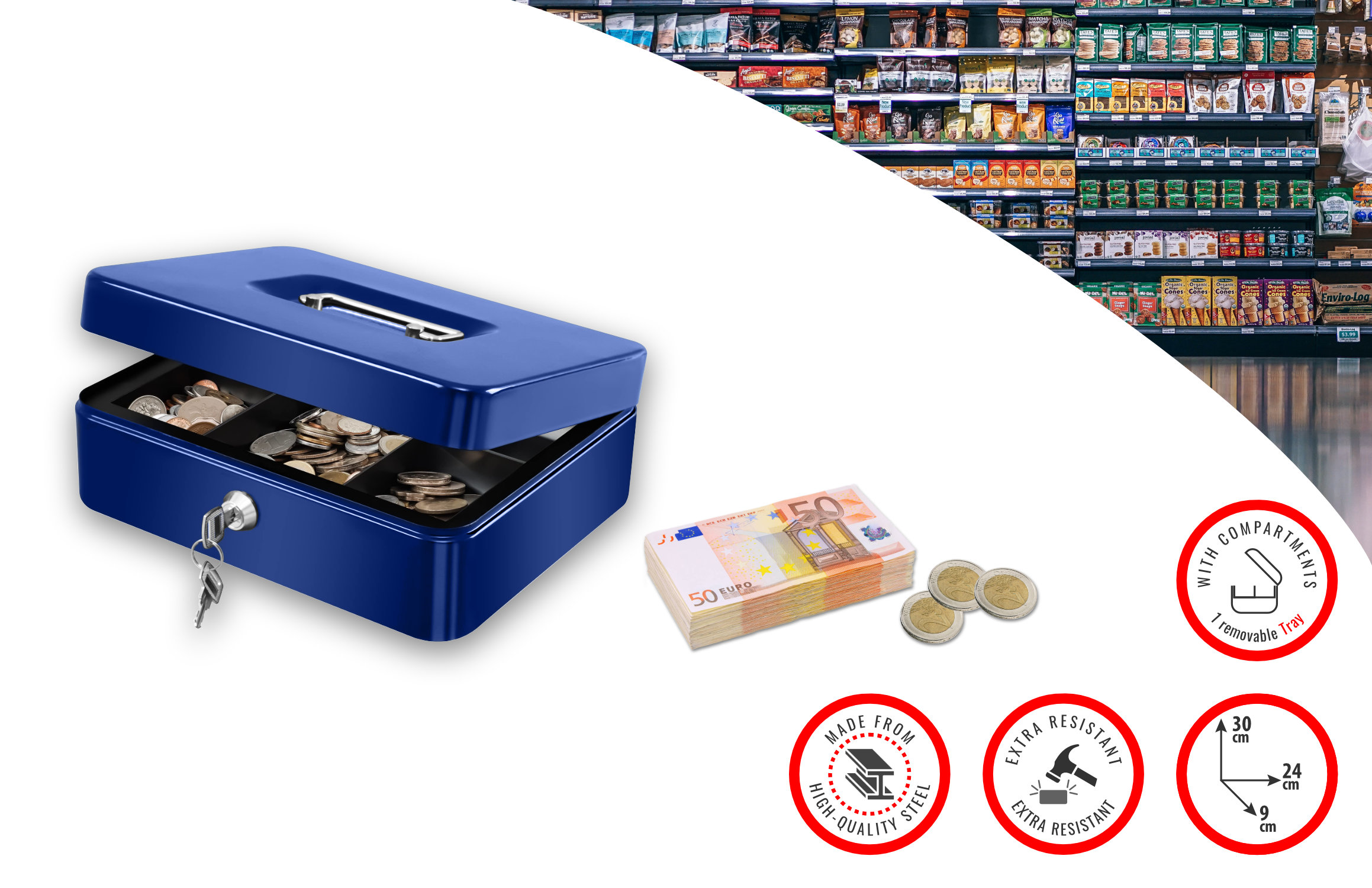 Markin Cash Box with cylinder lock & 2 keys mod. 167-4, size 300x240x90, includes a removable plastic tray with partitions, also serving as a cover to underlying bank notes compartment, easy stowing thanks to its recessed metal handle, robust full metal construction.