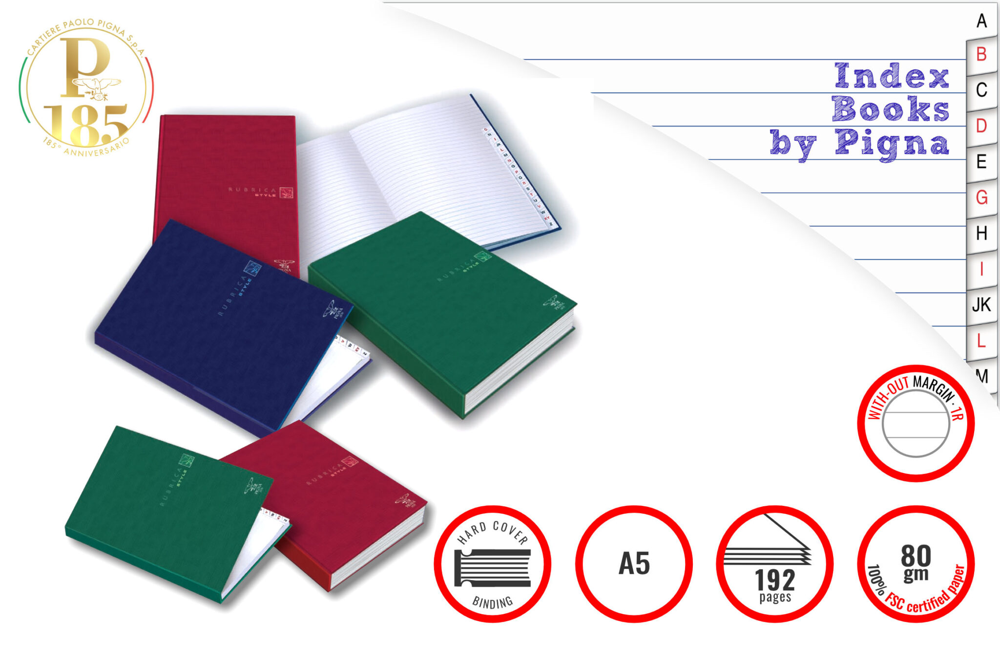 Pigna Index Book Hardback A5 96 sheets, 192 pages, Ruled Assorted colours STYLE Cartiere Paolo Pigna Italy