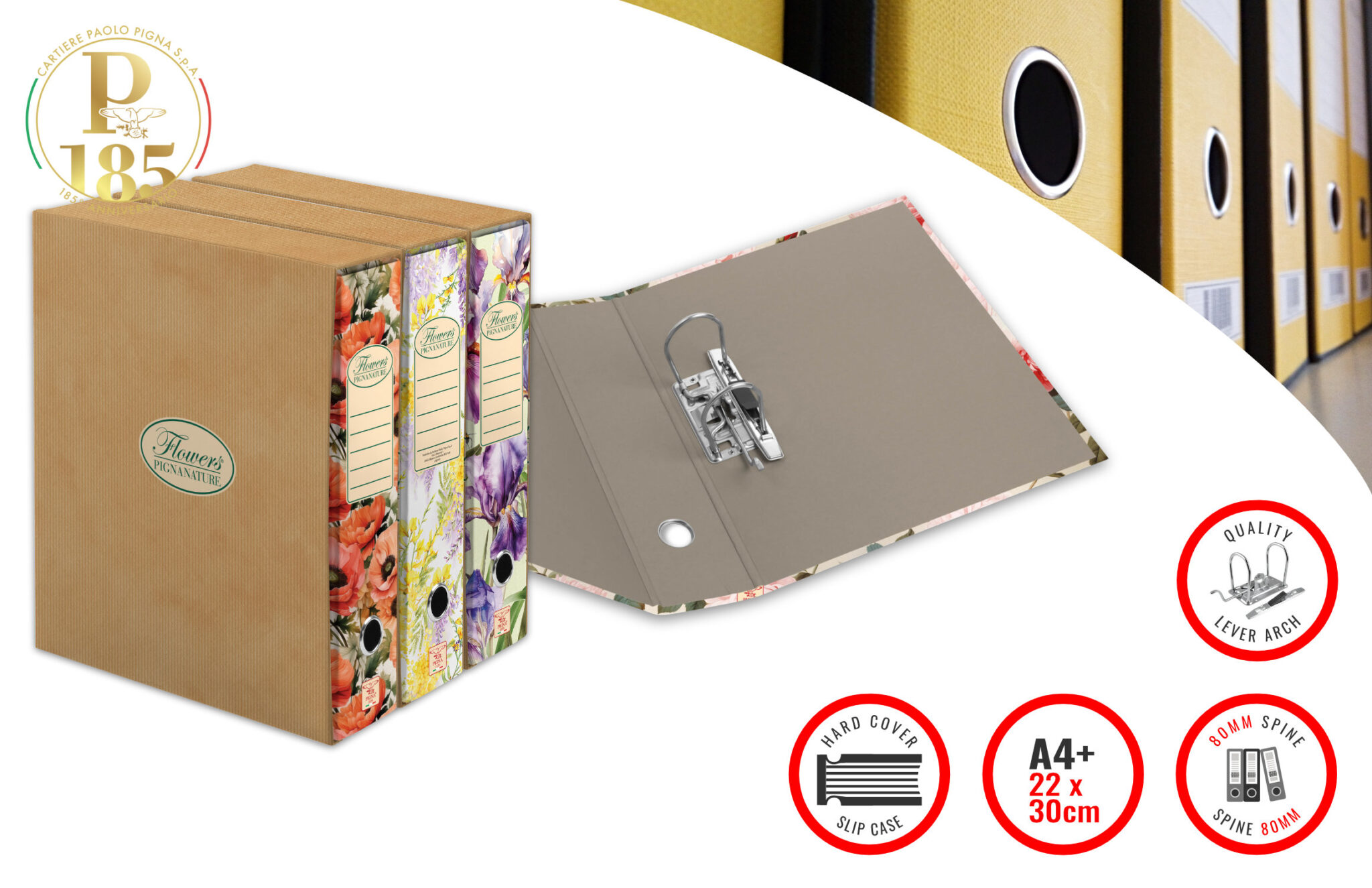 Pigna Lever Arch File Internal size 22x30mm, spine 80mm with spine label, unique hard bound slip case box increases stability when stacked over a shelve or on top of each other both vertically and horizontally,  perfectly suitable for archiving avoiding dust and debris to damage filed documents, and avoids fall out documents when carrying around, ideal for use on open shelves, front office, lectures and college, assorted 4 designs PIGNA Nature Flowers, external size 28.5×33.5x8cm, code 0223325 Cartiere Paolo Pigna Italy