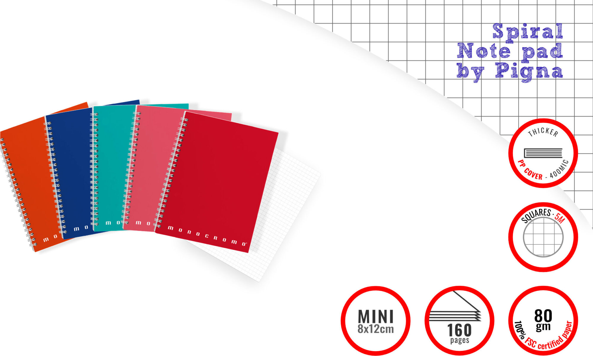 Pigna NotePad Spiral Mini 8x12cm, 80sheets White, 5mm squares, 160 pages 80g/m paper, wire O top bound, front and back Cover made of transparent PP 400mic, Assorted colours MONOCROMO code 0219661 5M Cartiere Paolo Pigna Italy