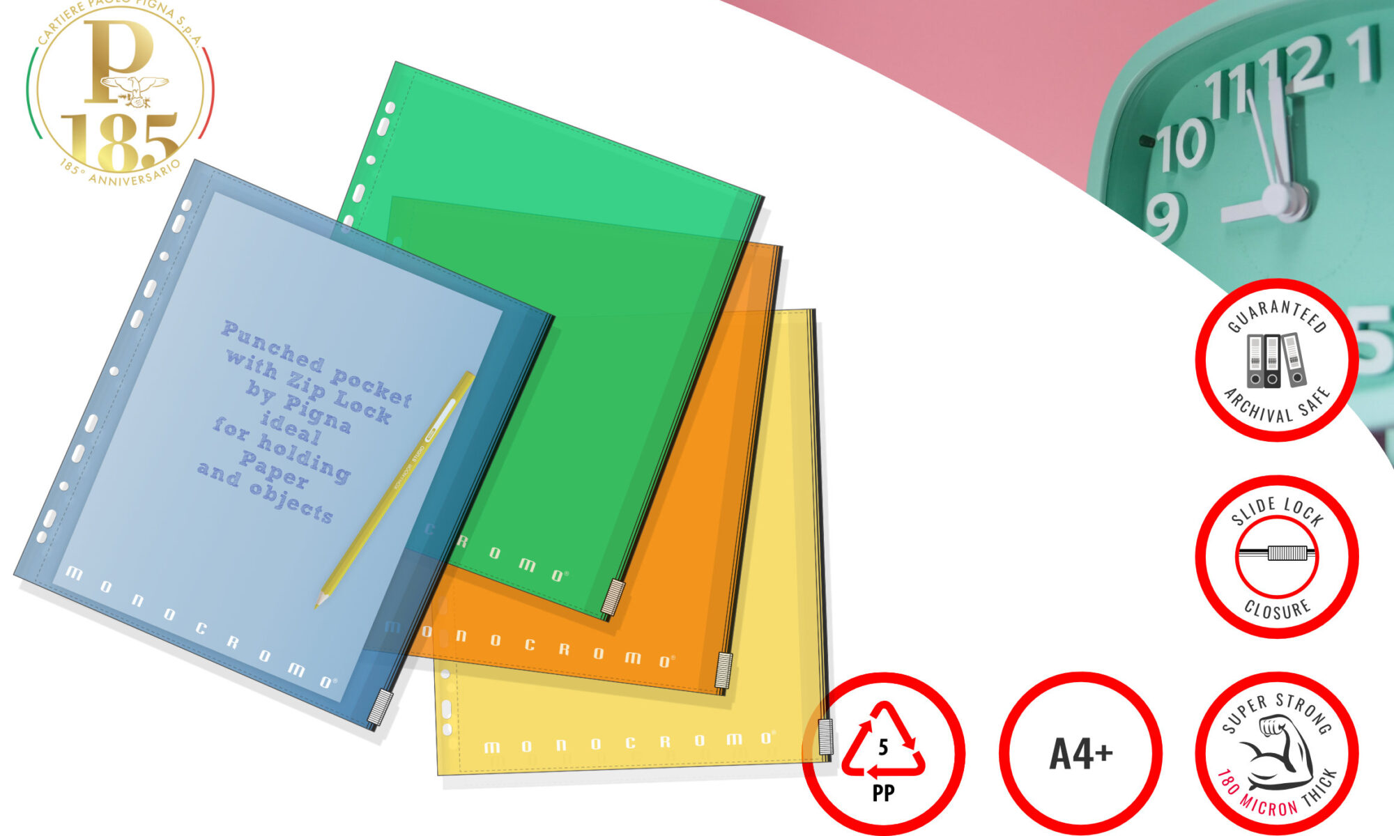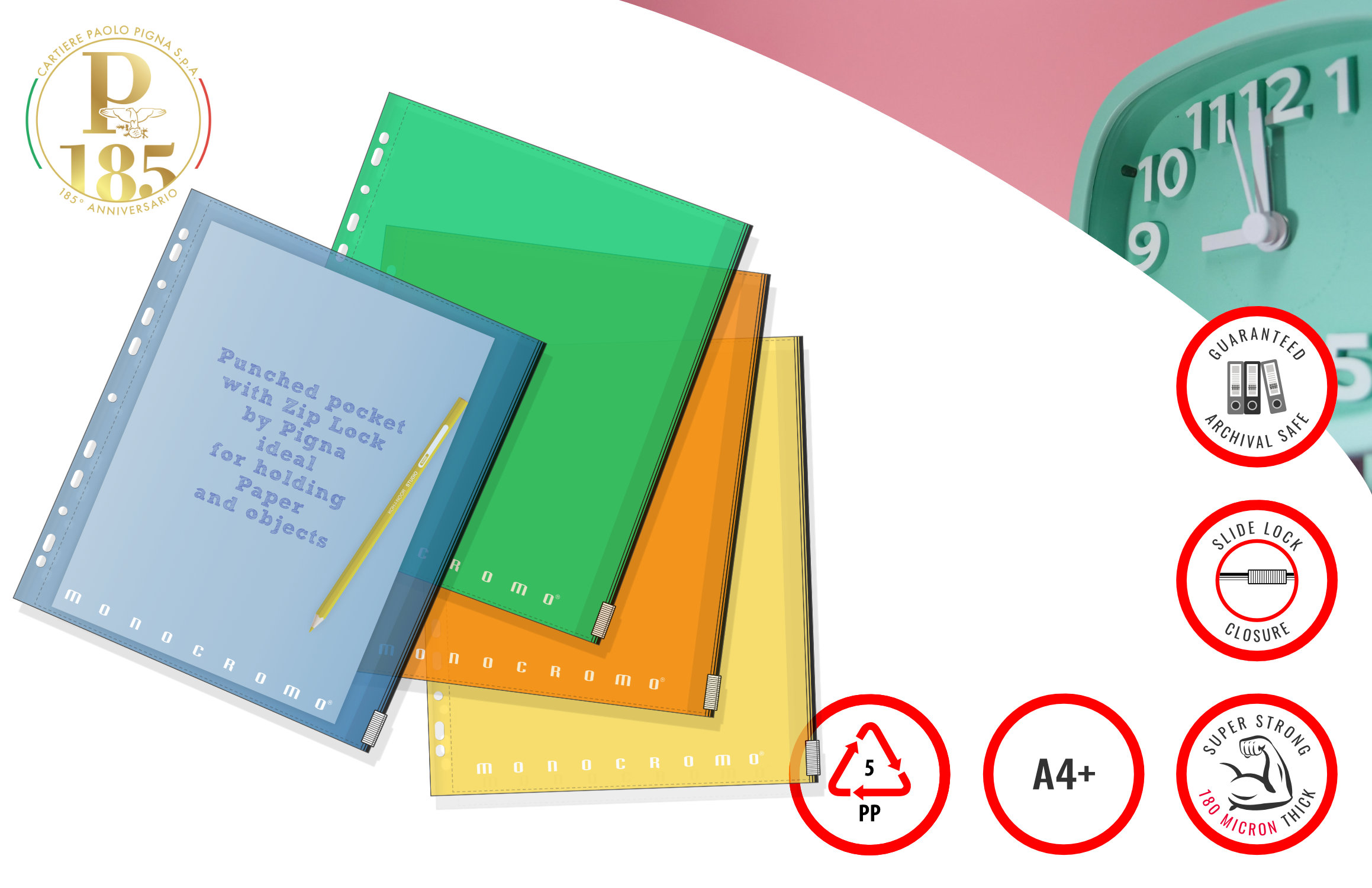 Pigna Punched Pocket A4+, made of 180mic Polypropylene, with side opening and Zip Lock, Assorted colours blue, green, orange, yellow, protects your documents from dust and water spillage, practical for mobile office presentations, for field work, for classrooms, at home, MONOCROMO code 0227921 00 Cartiere Paolo Pigna Italy
