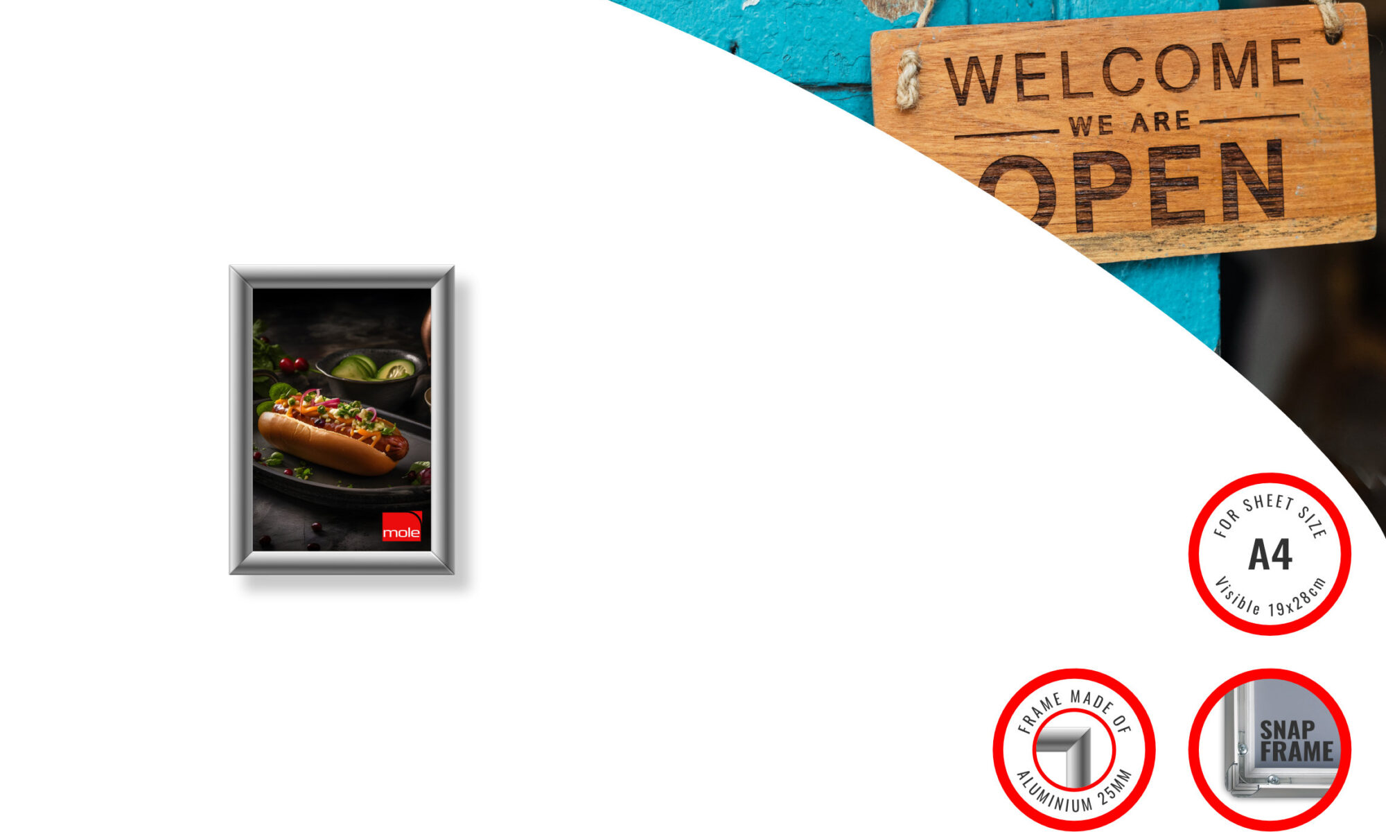 Poster Snap Frame A4, 25mm Mitred Profile Silver anodised Aluminium, including clear rigid PVC cover sheet, wall mounting fixtures included (4 dowels screws and eyelets), frame size 240x330mm, visible picture size 190x280mm.