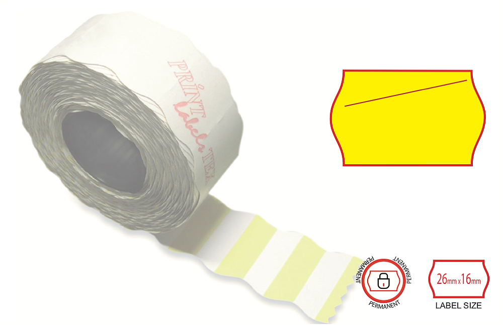 Pre Print labels 2616 1 colour permanent 4, fluorescent yellow 26x16mm labels, high tack permanent adhesive, ideal for use on non porous materials like plastic or plastic coated products, glass and tin, with pre printed red cut on the top line ideal for discounts, sale or special offers, to be used with double line price labellers, compatible with major brands including Print labellers model S18, V6 Maxi, V18, Z, roll by 1000 labels, made in Italy